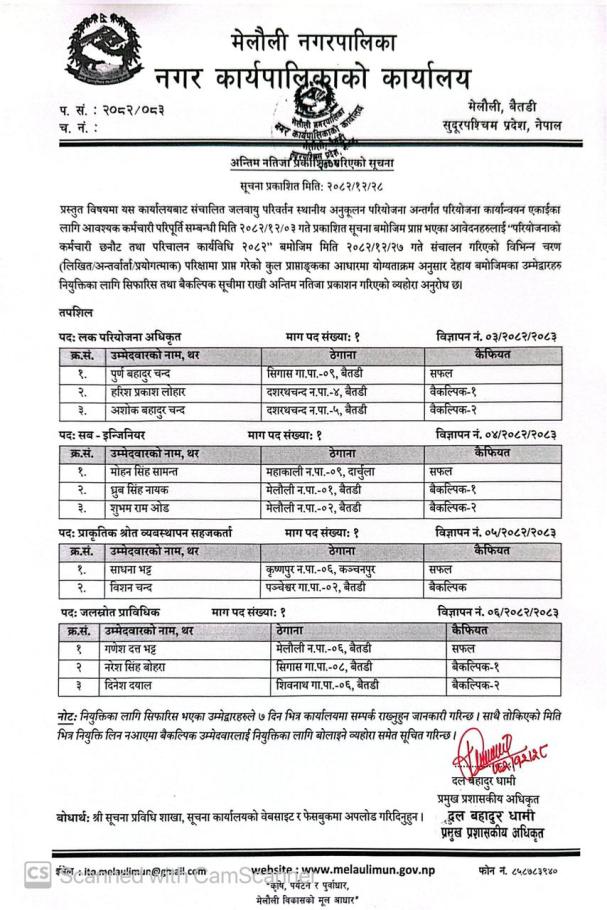LACC परियोजनाका लागि जनशक्ति पदपूर्तिको अन्तिम नतिजा प्रकाशन सम्बन्धमा