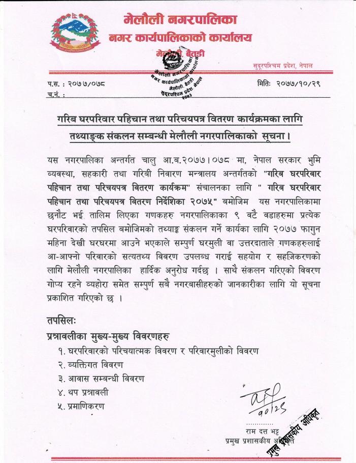 गरिब घरपरिवार पहिचान तथा परिचयपत्र वितरण कार्यक्रमका लागि तथ्याङ्क संकलन सम्बन्धी मेलौली नगरपालिकाको सूचना
