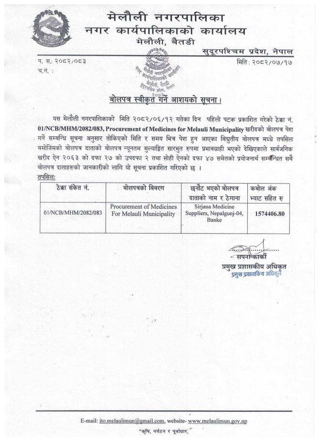 » बोलपत्र स्वीकृत गर्ने आशयको सूचना ।